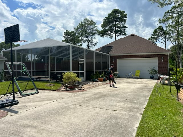 • a blue house with a screened in porch is sitting on top of a lush green lawn