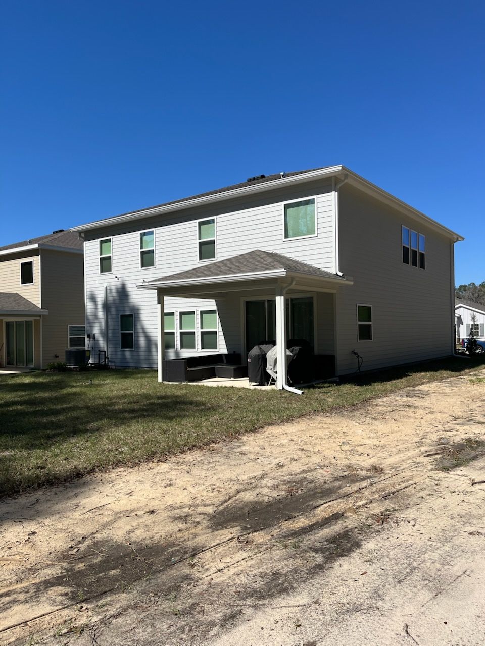 • A large house with a lot of windows is sitting on top of a lush green lawn.