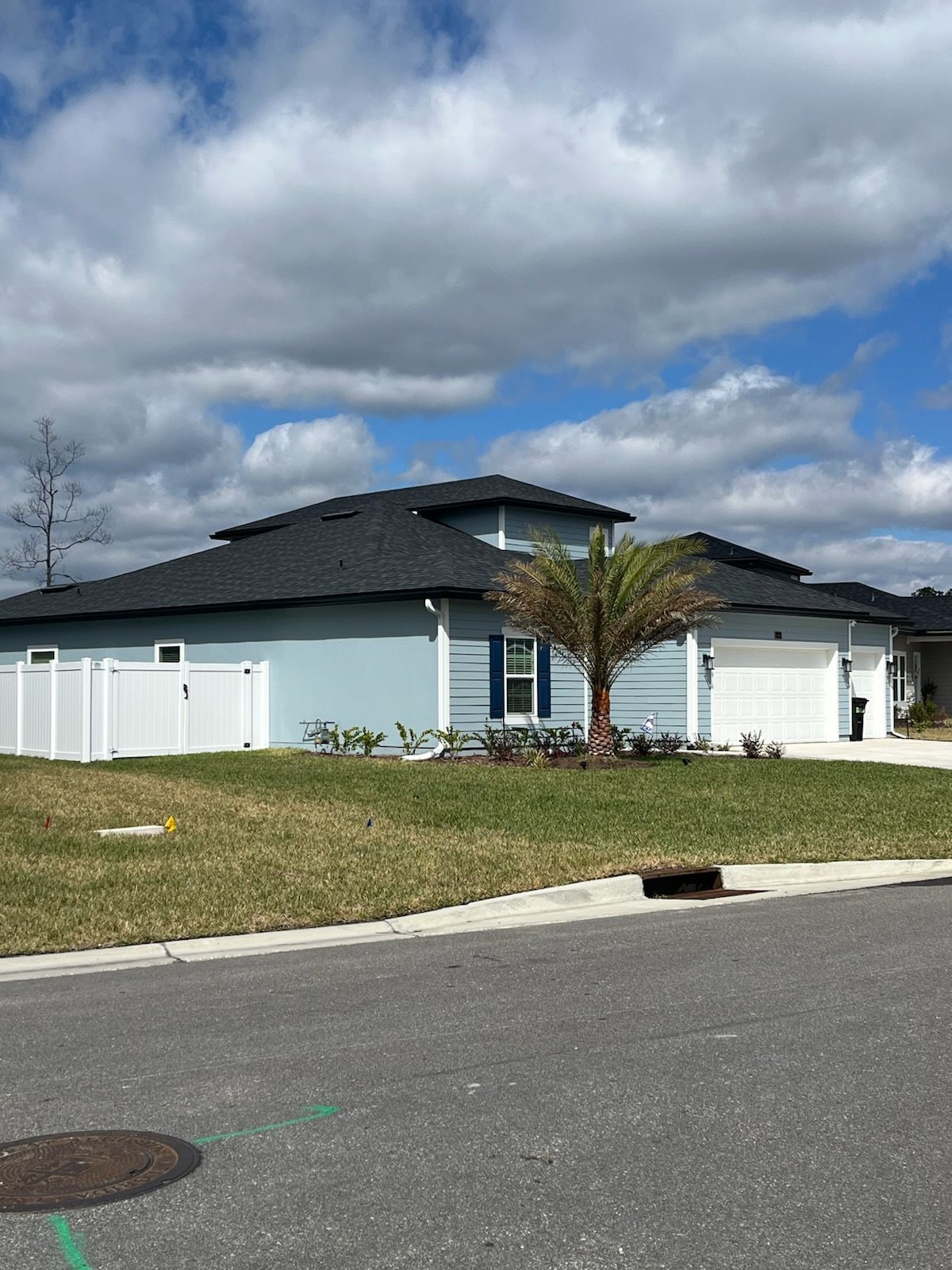 • a blue house with a black roof is sitting on top of a lush green lawn